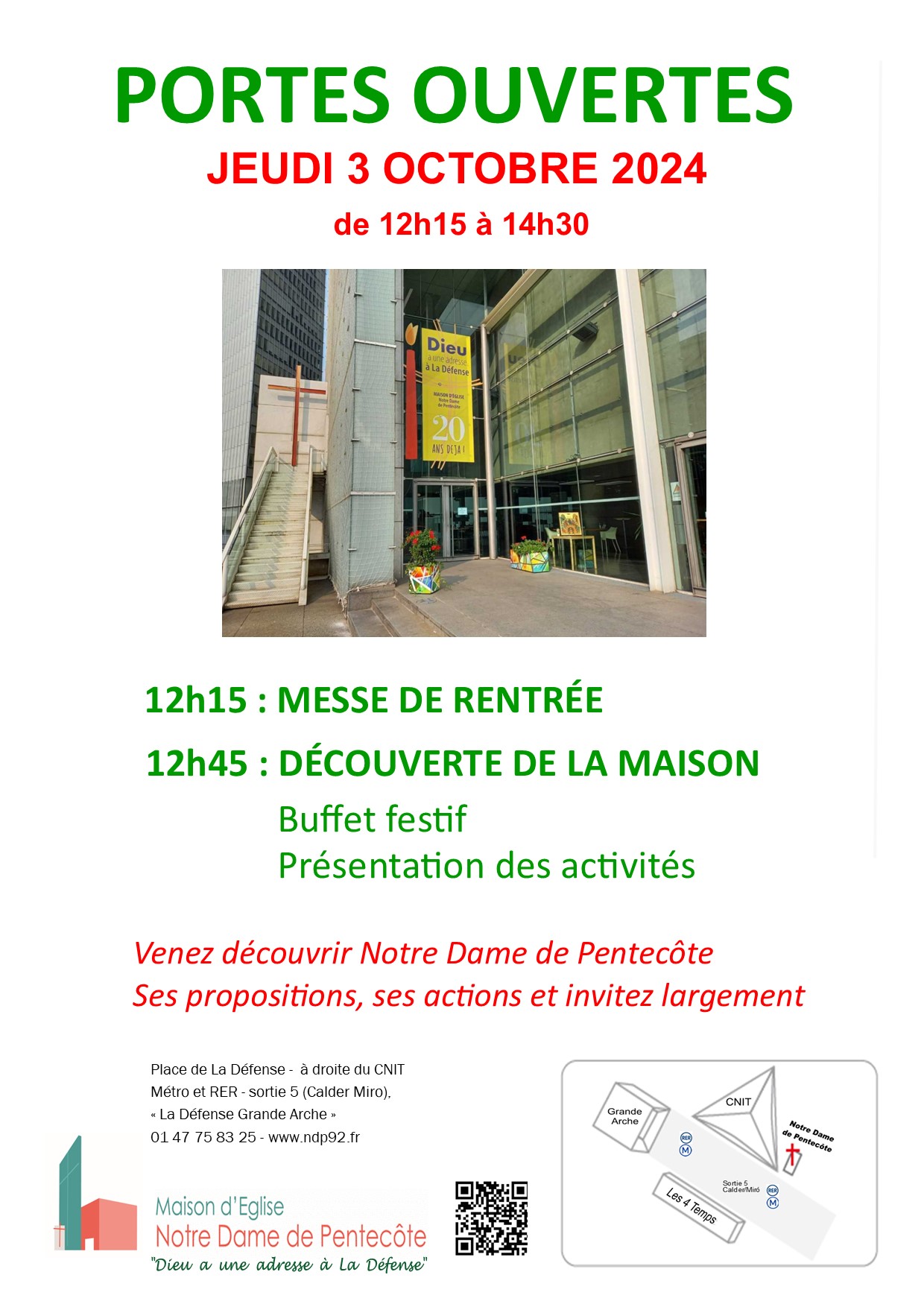 Jeudi 3 octobre – Portes ouvertes Écrit le 4 septembre 2024. Publié dans Evenements passés. Venez découvrir Notre Dame de Pentecôte, ses propositions, ses actions et invitez largement! 12h15 Messe de rentrée 12h45 Découverte de la Maison : Buffet festif – Présentation des activités « Précédent Suivant »