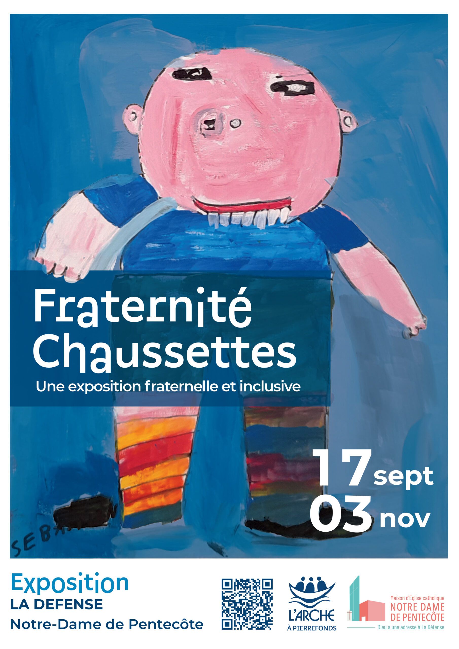 « Fraternité-Chaussettes », tel est le titre de l’exposition, choisi par les personnes handicapées de l’atelier Arts plastiques de l’Arche de Pierrefonds, dans l’Oise. Avec un brin de malice et de décalage apparent, ce titre nous parle de la vie communautaire, de ses inévitables guirlandes de chaussettes orphelines, feutrées, usées, sans importance, mais aussi de la comparaison et du mimétisme : « Tiens ! Nous avons presque les mêmes ! ». Ou comme me disait un homme handicapé en regardant mes chaussettes : « Elles sont minables ! », réflexion suivie d’un énorme éclat de rire ! Il faut reconnaître que les siennes étaient très colorées !