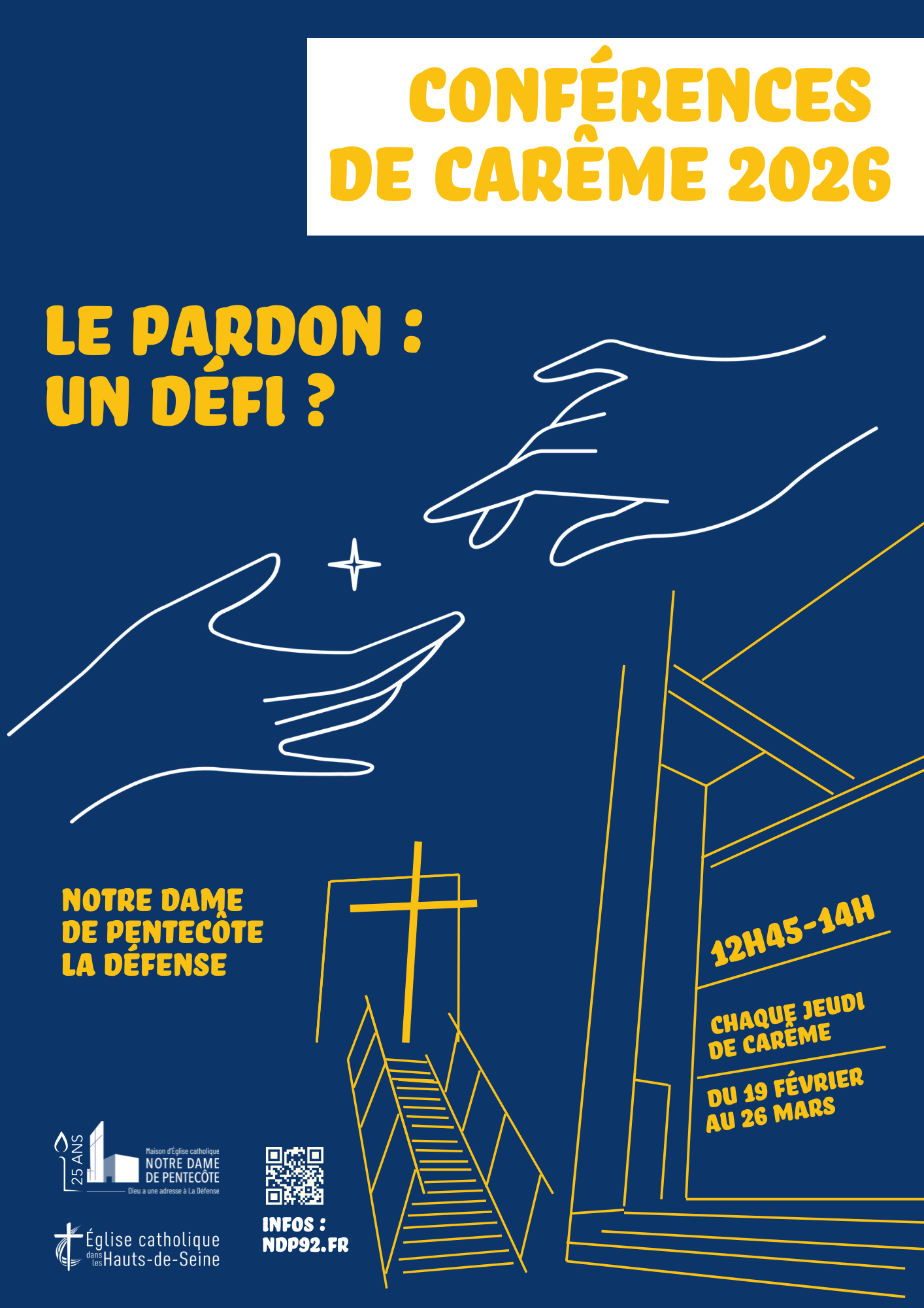 Conférences de Carême 2026 Écrit le 5 février 2026. Publié dans A la une. Le carême est dans moins de deux semaines! Nous sommes heureux de vous inviter au nouveau cycle de conférences à ND de Pentecôte : Le Pardon : un défi? Jeudi 19 et 26 février, 5, 12, 19 et 26 mars, de 12h50 à 14h. « Précédent