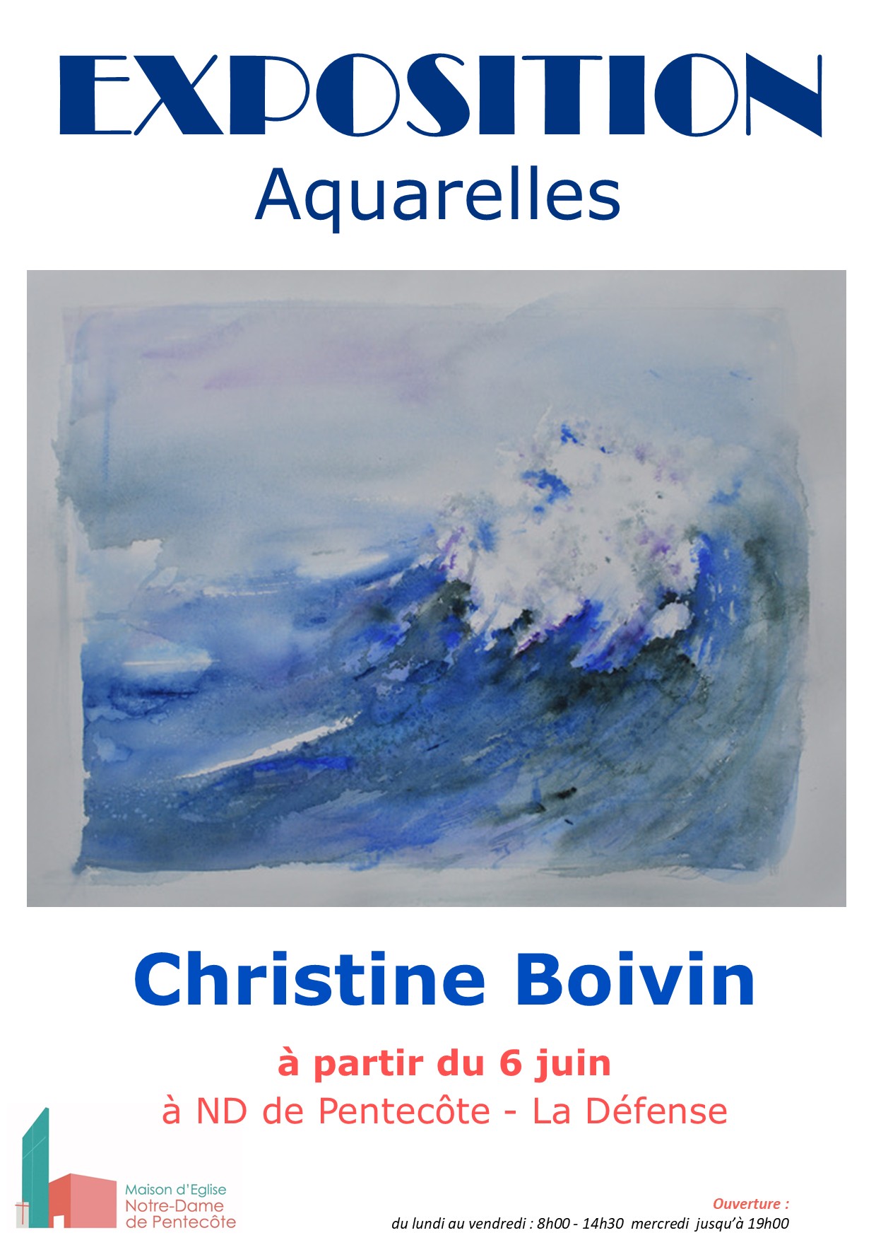 Mercredi 4 juin 2025 à 12h et 15h, aura lieu le vernissage de la nouvelle exposition à ND de Pentecôte : des aquarelles par Christine Boivin.