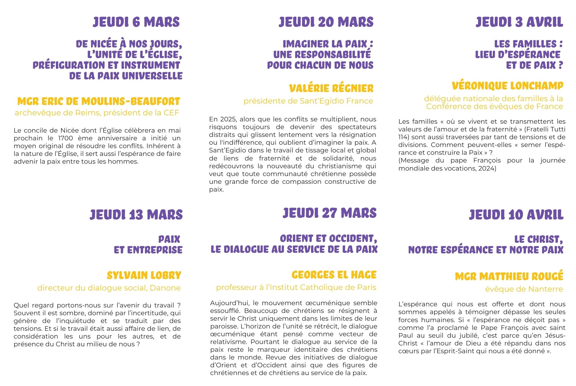 En outre, six « conférences de Carême » sont proposées chaque jeudi de Carême à 12h45 dans le hall de Notre Dame de Pentecôte.